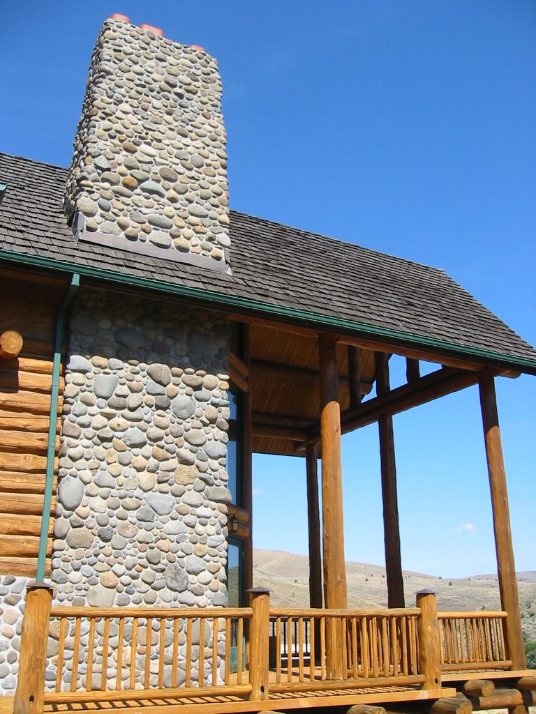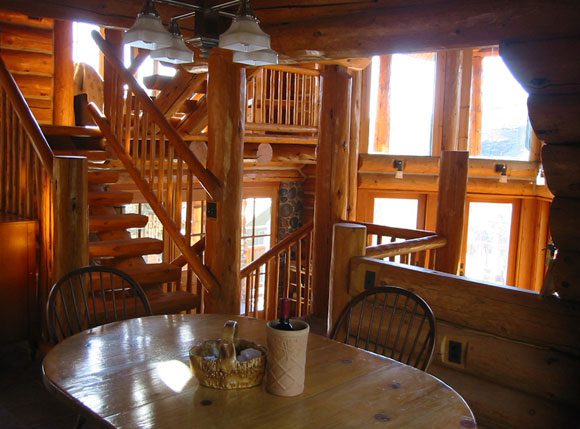 The home uses all natural materials: Deschutes river rock, and beetle-kill pine logs harvested, peeled and assembled locally. The largely open interior consists of several levels unified by a central log stair, creating a “tree house of lofts.”