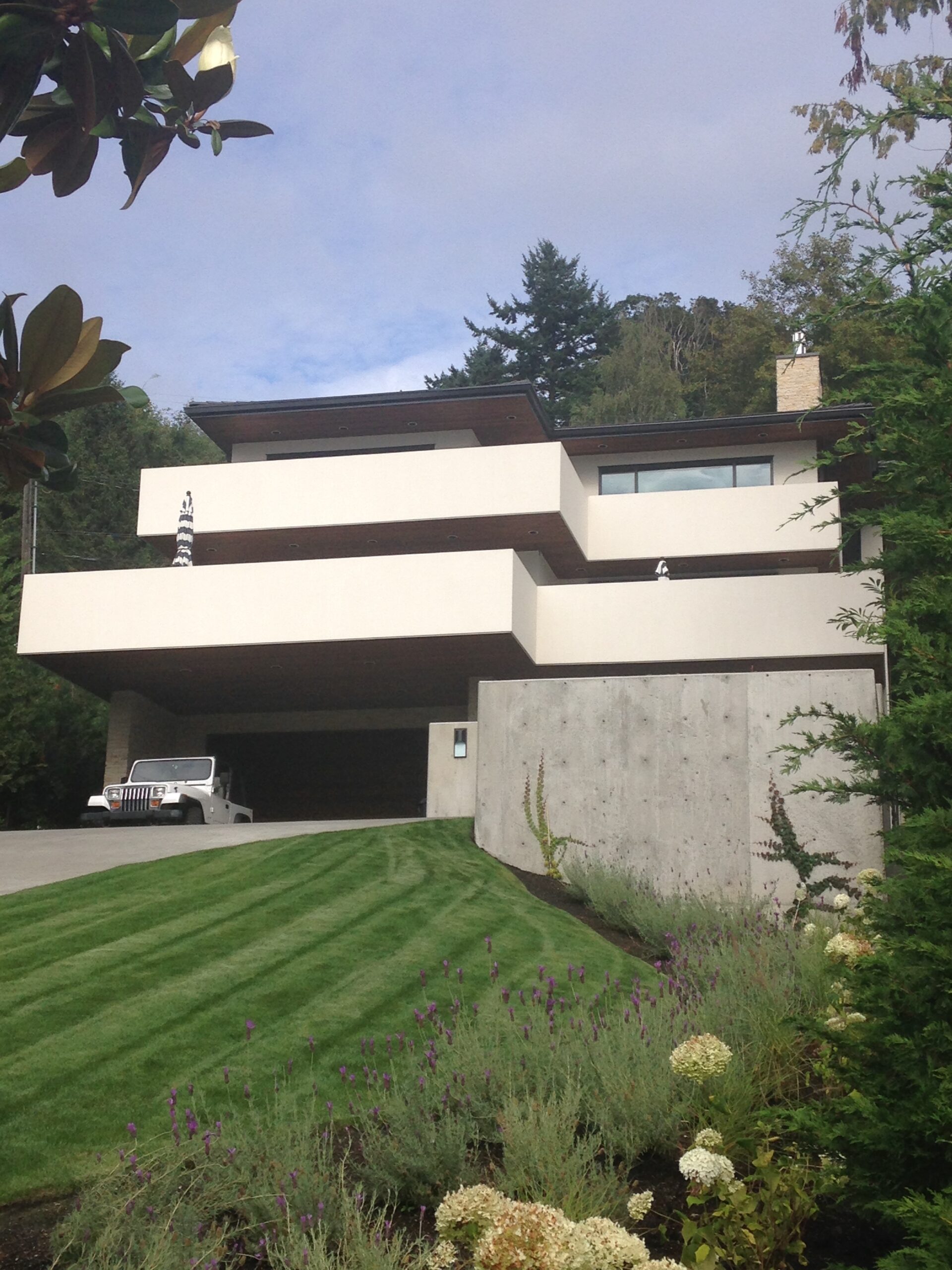 This JB project is a modernist tour de force, proclaiming heroic modern minimalism while sensitively keeping ties with Northwest regionalist principles. Expansive decks bounded by Wrightian bulkhead walls, along with broad overhanging natural wood soffits, connect indoors with outdoors. The home’s view gazes to the Puget Sound through abundant glass.