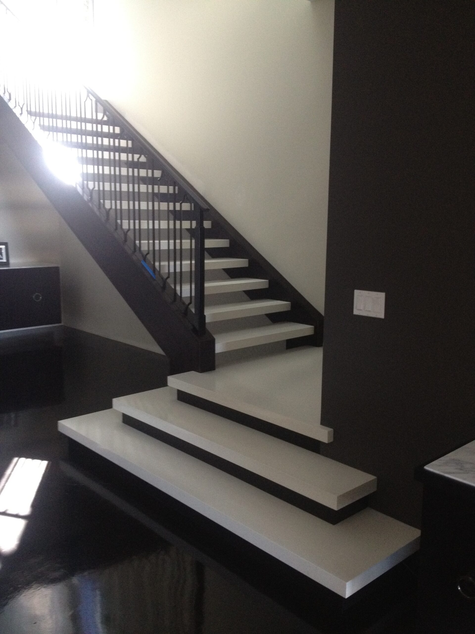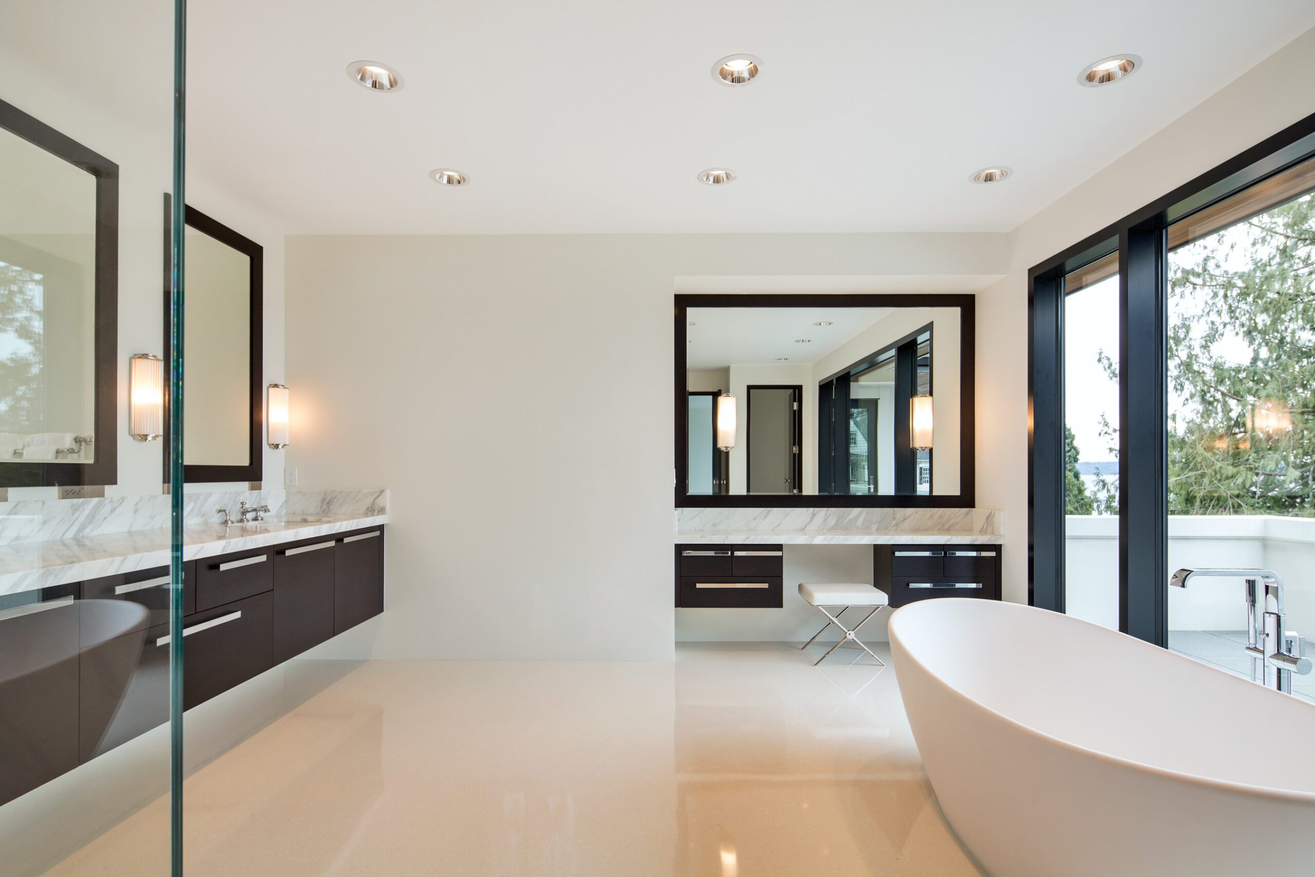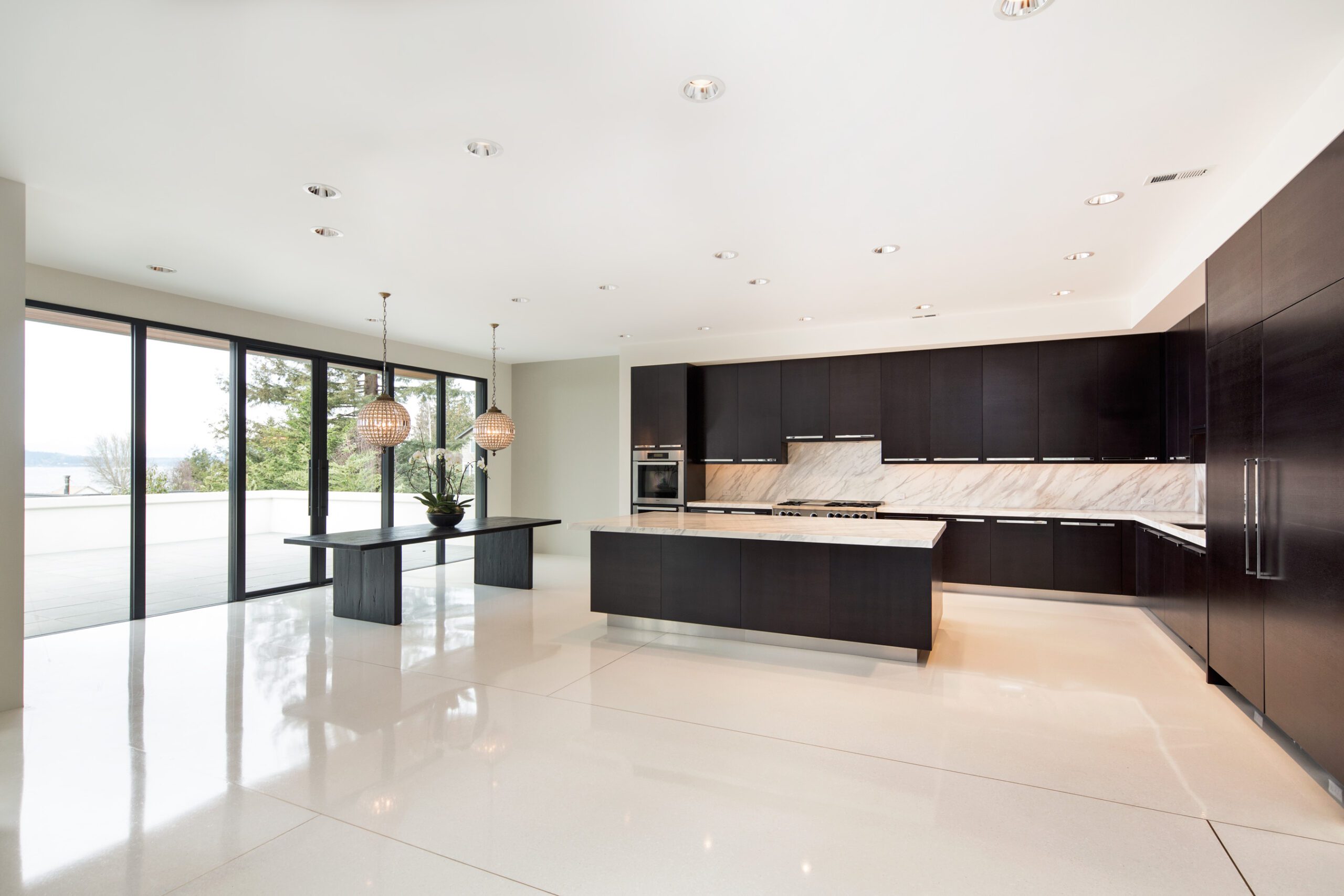 There are no trim moldings; natural wood is expressed in doors and cabinets only. The main and upper floors, along with linking floating stair treads, are cast in gleaming white terrazzo finish, while the daylight basement is grounded in dark stained concrete. This project demonstrates JB Architecture can comfortably converse in contemporary design vocabulary.